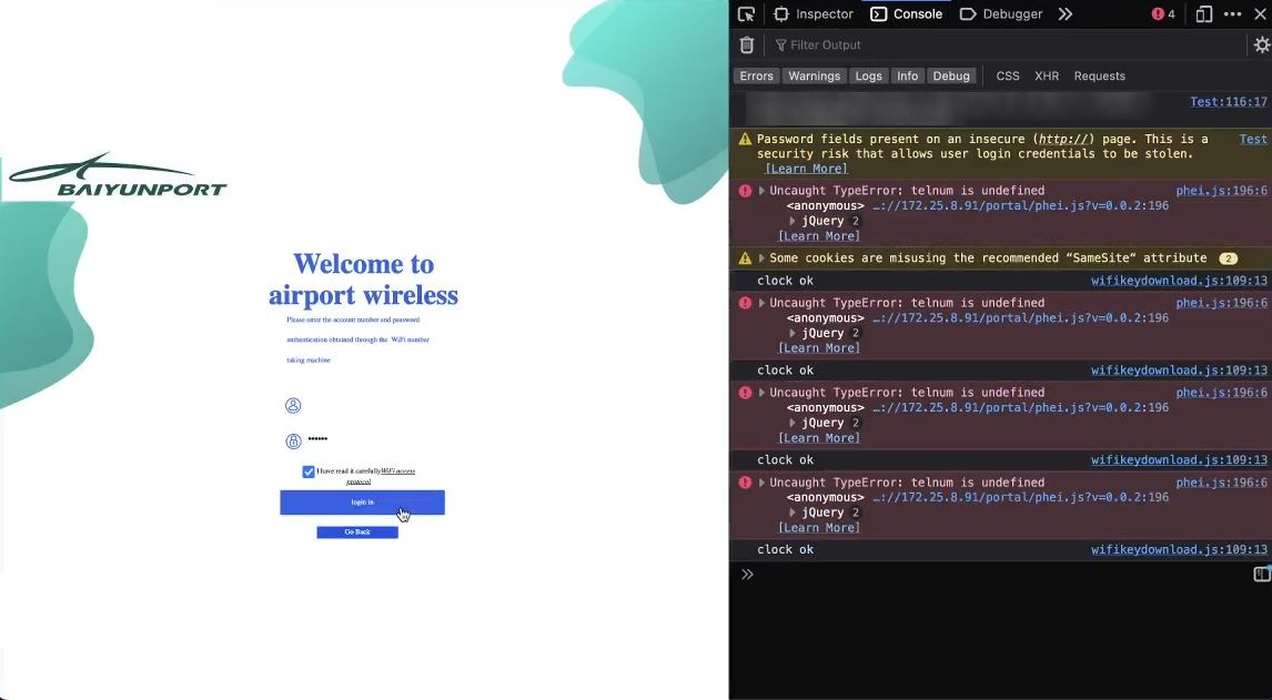 Now at the end of the day, I didn’t really do any real hacking. To be honest I did the opposite, I fixed the airport’s broken wifi portal. The problem with their website was, the logic used to log someone in via telephone number was being used for people that were trying to log in with their account number. This meant that things were breaking client side and no HTTP request was sent. These were fixed in three steps: